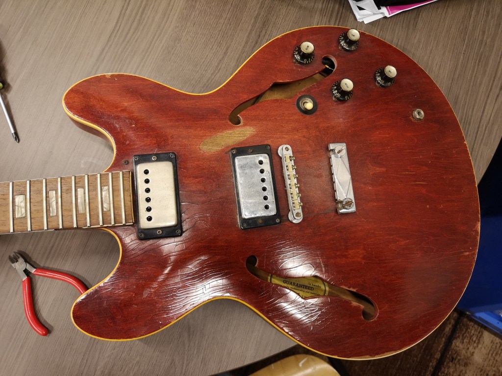 About a month ago a guy walks into our shop. He has an old Gibson, that he hasn’t played for years. It was given to him by his uncle when he was a kid. It’s some kind of ES model, he can’t recall the number and it must be from the fifties or sixties. So the golden age of electric Gibson guitars. He wants to have it fixed so it can be played again.