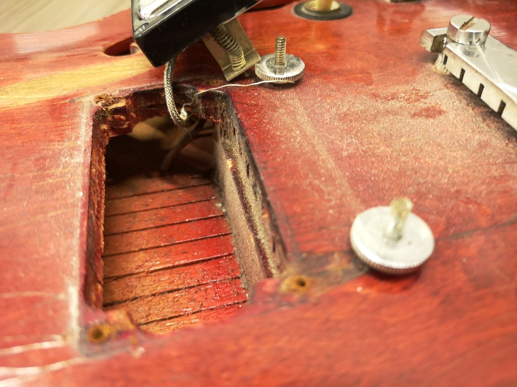 We hook it up and no sound. After fiddling with the toggle switch I manage to get some sound out of the neck pickup. The strings are old and there is also one string missing, but from what I hear it sounds kinda cool.